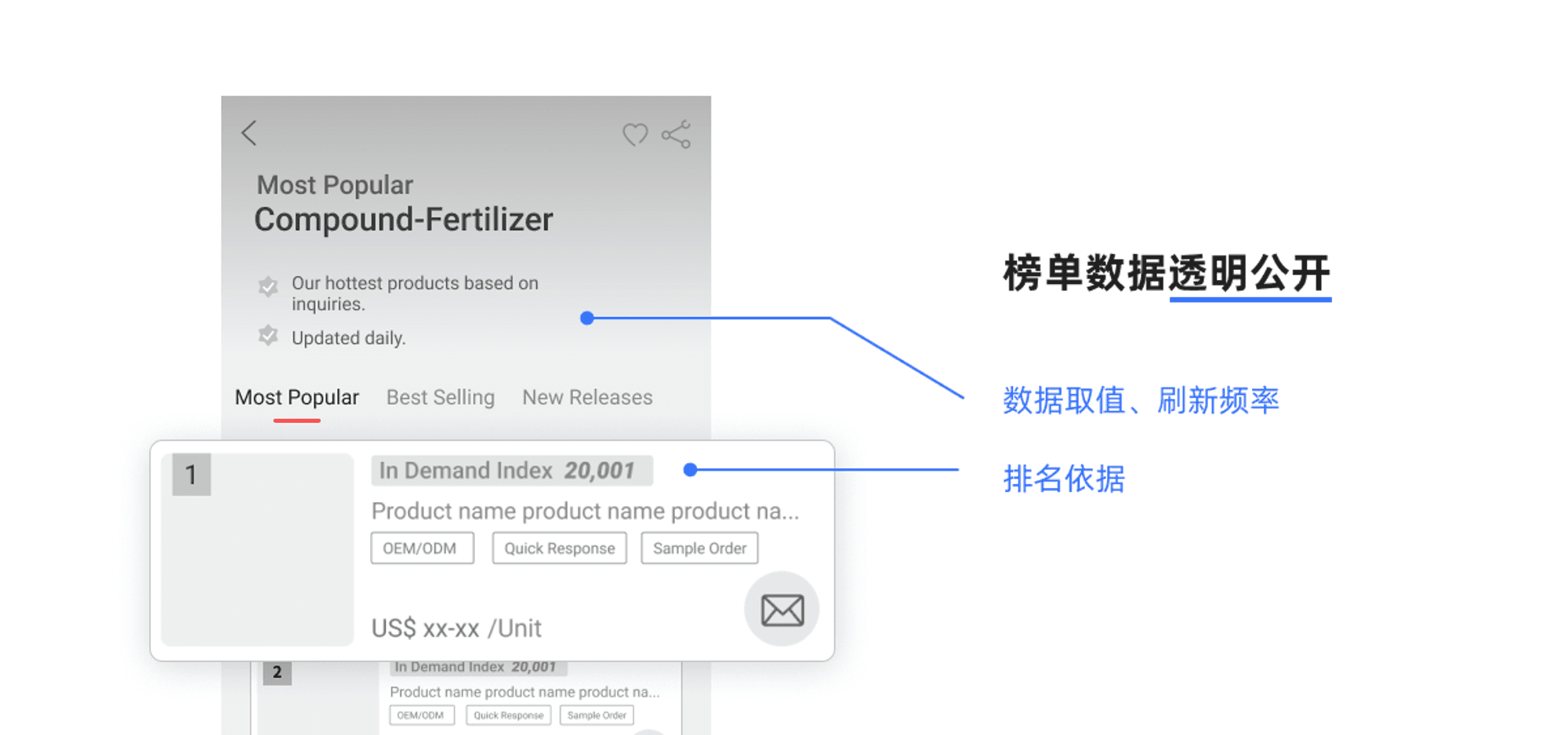 首先,我们把榜单排名指标透明化,让数字自己说话。排名中每一个产品或供应商,我们把它当前排名的数据依据显示在了界面上。根据榜单类型的不同,显示的内容也有不同。